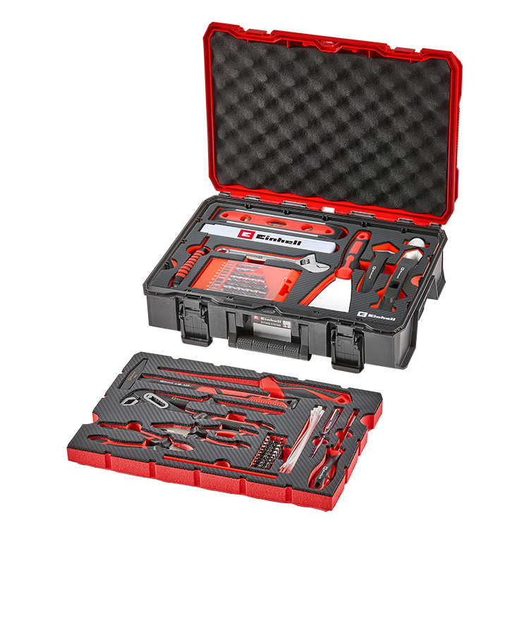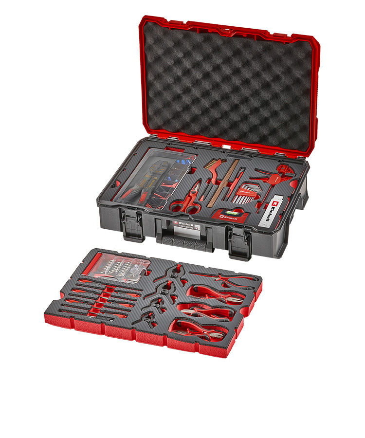 Gestartet wird mit einem leeren Einhell E-Case Koffer. Er ist stapelbar, robust und bildet die Grundlage für das Mix & Match System.