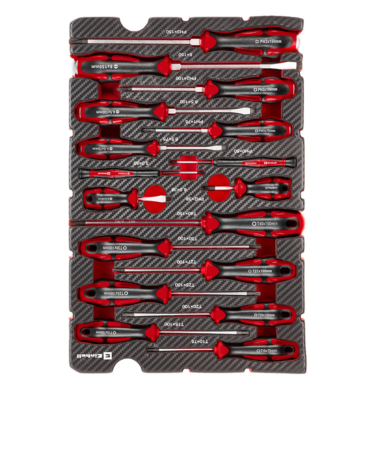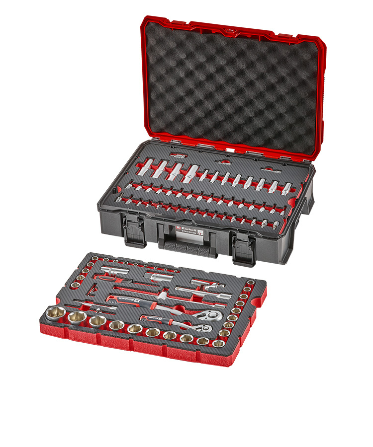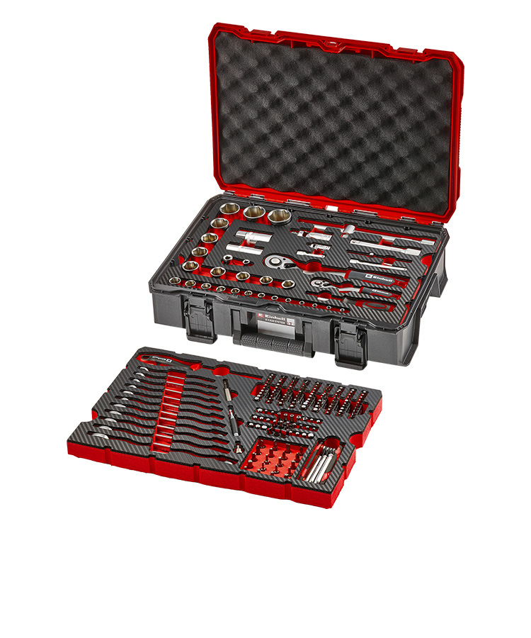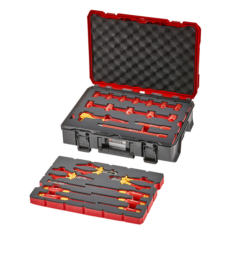 Ein leerer E-Case-Koffer dient als Basis und wird mit zwei flexibel kombinierbaren Werkzeugpads zu einem individuellen Werkzeug-Set ausgestattet.